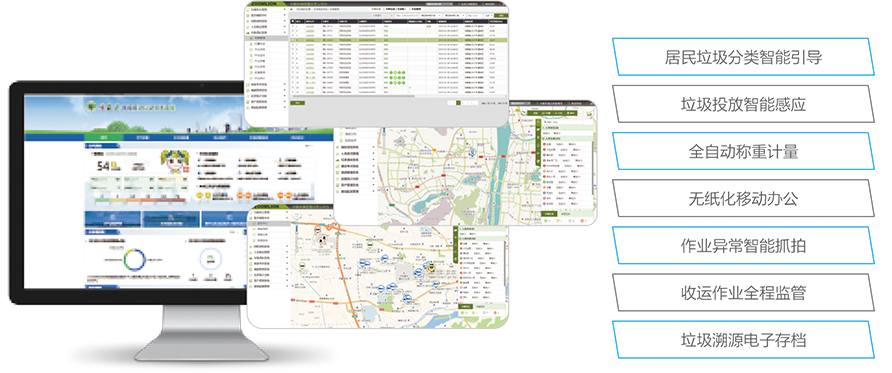 垃圾桶实时监控:摆放位置、投放、满箱监控。垃圾袋发放实时监控:摆放位置、发放、缺货监控。
